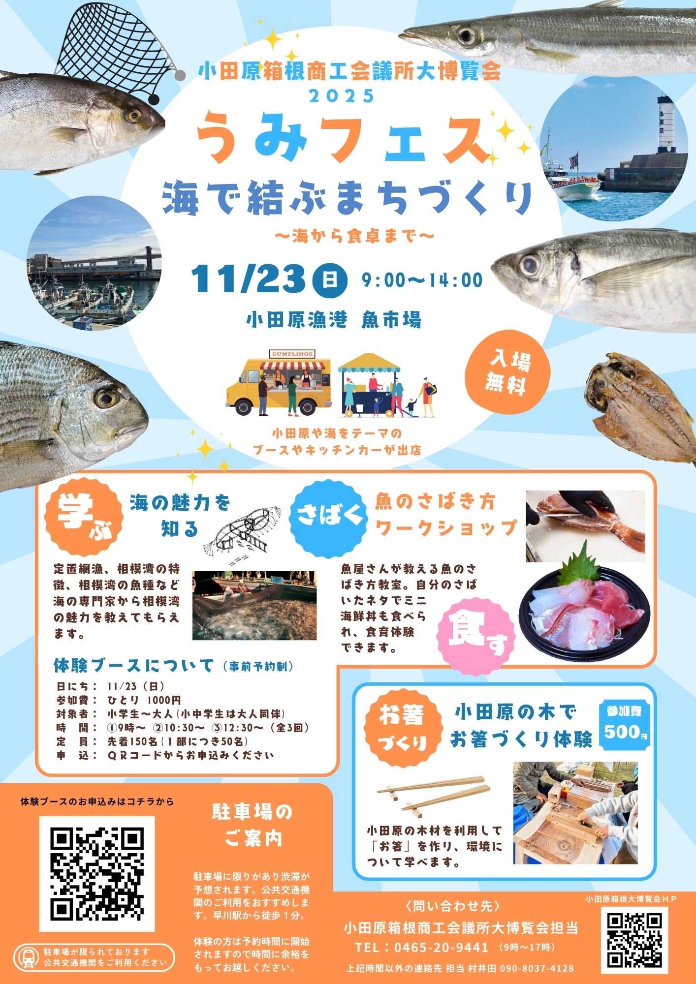 定置網漁、相模湾に生息する魚種など小田原の海の特徴を専門家が説明してくれます。さらに、魚のさばき方教室やお箸づくりなど、採れた魚がどのように食卓まで届くのか、大人も子供も「学んで」「食べて」「体験できる」企画が盛りだくさんです。